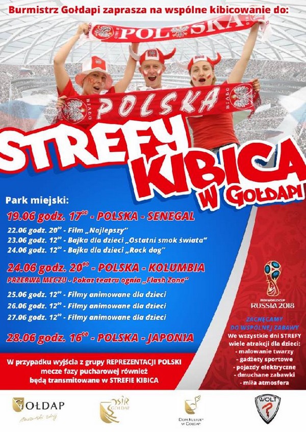 Burmistrz Gołdapi Tomasz Luto zaprasza na mundialowy pojedynek Polska – Senegal. Gołdapska strefa kibica w parku miejskim przy pl. Zwycięstwa rusza we wtorek, 19 czerwca, o 16:00. Początek spotkania o godz. 17:00. Wspólnie kibicujemy biało-czerwonym!