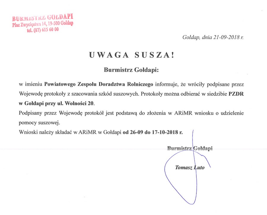 Burmistrz Gołdapi w imieniu Powiatowego Zespołu Doradztwa Rolniczego informuje, że wróciły podpisane przez wojewodę protokoły z szacowania szkód suszowych. Protokoły można odebrać w siedzibie PZDR w Gołdapi przy ul. Wolności 20.