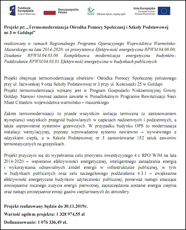 Budynek Szkoły Podstawowej nr 3 w Gołdapi oraz budynek Ośrodka Pomocy Społecznej w Gołdapi zostaną poddane termomodernizacji. Dzięki termomodernizacji budynek szkoły zyska nową elewację. Natomiast prace związane z budynkiem Ośrodka Pomocy Społecznej obejmować będą m.in. docieplenie ścian piwnic, posadzek, dachu budynku, a także zostanie wykonana mechaniczna wentylacja podpiwniczenia. Prace przewidziane są na drugi i trzeci kwartał roku. Wartość całego przedsięwzięcia to 1 328 974,55 zł, natomiast wysokość dofinansowania to 1 076 336,49 zł. Projekt jest współfinansowany ze środków Europejskiego Funduszu Rozwoju Regionalnego w ramach Regionalnego Programu Operacyjnego Województwa Warmińsko-Mazurskiego na lata 2014 -2020. Dofinansowanie wynosi ponad 1 mln zł.