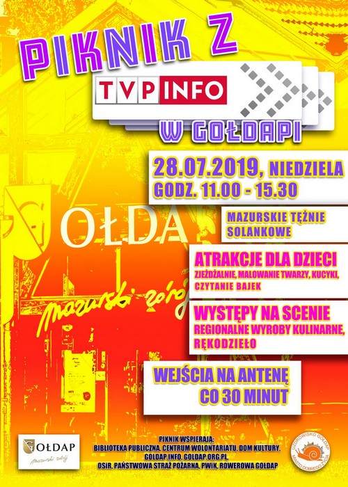 Niedawno wyjechała od nas ekipa TVN24 oraz TVN BIS, a już zmierza do nas kolejna... W najbliższą niedzielę Gołdap będzie miała swoje, kolejne już, „5 minut” w telewizji! Choć zdecydowanie nie będzie to jedyne 5 minut, ponieważ wejść „na żywo” będzie kilkanaście! Mówimy tu o Pikniku z TVP INFO, który odbędzie się w niedzielę 28 lipca przy Mazurskich Tężniach Solankowych. Sam piknik rozpocznie się o godz. 11:00 i trwać będzie do 15:30. W tym czasie na dzieci czeka moc atrakcji – malowanie twarzy, czytanie bajek, kucyki, dmuchane zjeżdżalnie. Dorośli również będą mieli co robić, gdyż podczas pikniku wiele będzie się działo na scenie, a na stoiskach rękodzielnicy będą oferowali swoje wyroby. Ponadto strażacy z KP PSP oraz wojskowej straży pożarnej, zaprezentują pokaz ratownictwa drogowego, medycznego, a także wysokościowego. Bądźcie z nami na tężniach od godz. 11:00, natomiast pierwsze wejście na żywo odbędzie się już o godz. 7:30!