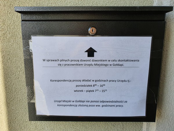 W związku z zagrożeniem rozprzestrzeniania się koronawirusa w Polsce przed wejściem do budynku Urzędu Miejskiego w Gołdapi została umieszczona skrzynka, w której mogą Państwo zostawiać korespondencję.