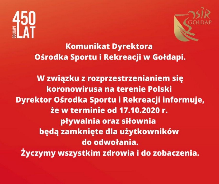 Urząd Miejski w Gołdapi przedstawia komunikat dyrektora Ośrodka Sportu i Rekreacji w Gołdapi.