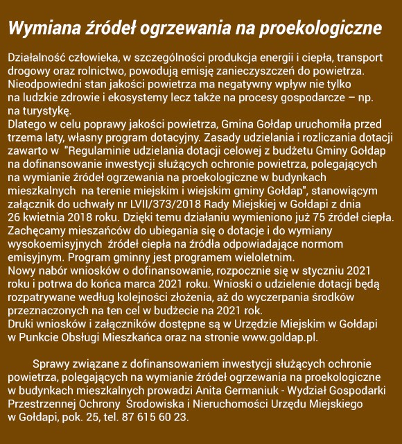 Sprawy związane z dofinansowaniem inwestycji służących ochronie powietrza, polegających na wymianie źródeł ogrzewania na proekologiczne w budynkach mieszkalnych prowadzi Anita Germaniuk - Wydział Gospodarki Przestrzennej Ochrony Środowiska i Nieruchomości Urzędu Miejskiego w Gołdapi, pok. 25, tel. 87 615 60 23.
