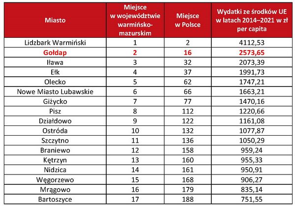 Gołdap 2 w województwie warmińsko-mazurskim i 16 w kategorii miast powiatowych w rankingu wykorzystania środków UE przez samorządy w latach 2014–2021.