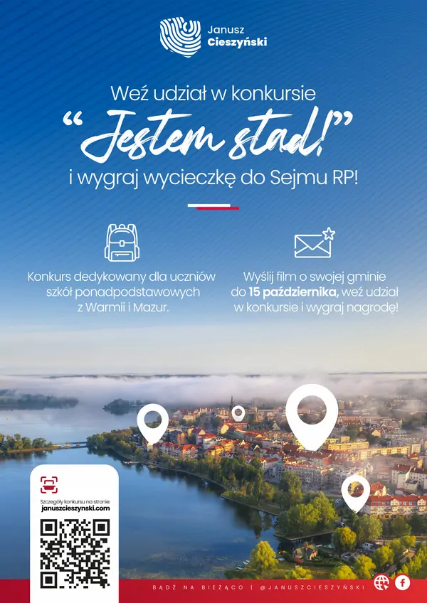 Poseł Janusz Cieszyński zaprasza młodzież z województwa warmińsko-mazurskiego do wzięcia udziału w konkursie pt. „Jestem stąd”.