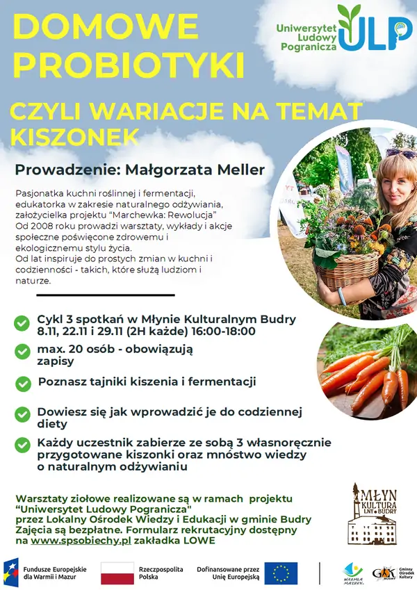 8 listopada rozpocznie się kolejny cykl spotkań - „Domowe probiotyki, czyli wariacje na temat kiszonek” z Małgorzatą Meller (zostały ostatnie wolne miejsca). Uczestnicy poznają nowe przepisy, sposoby fermentacji i dowiedzą się, jak tworzyć zdrowe, naturalne probiotyki w domowych warunkach. W planie m.in. kimchi, różowe chmurki, kiszone miksy warzywne, a także gotowanie z kiszonkami, od barszczu z boczniakami po placki z jabłkami na zakwasie.